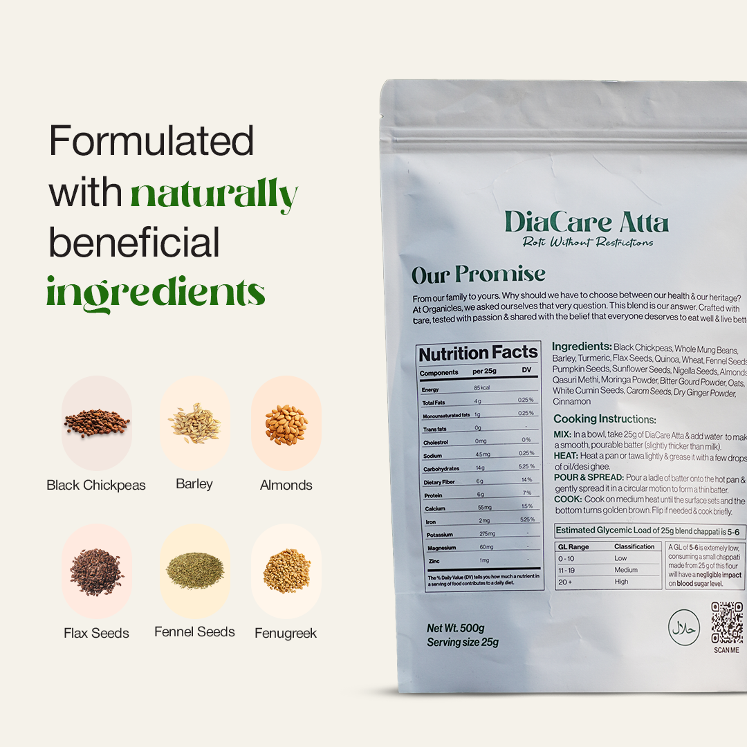 Introducing a scientifically balanced multigrain flour made with premium legumes, whole grains, seeds, herbs and functional botanicals — specially designed to support stable blood sugar, weight management, hormonal balance, and digestive health.
